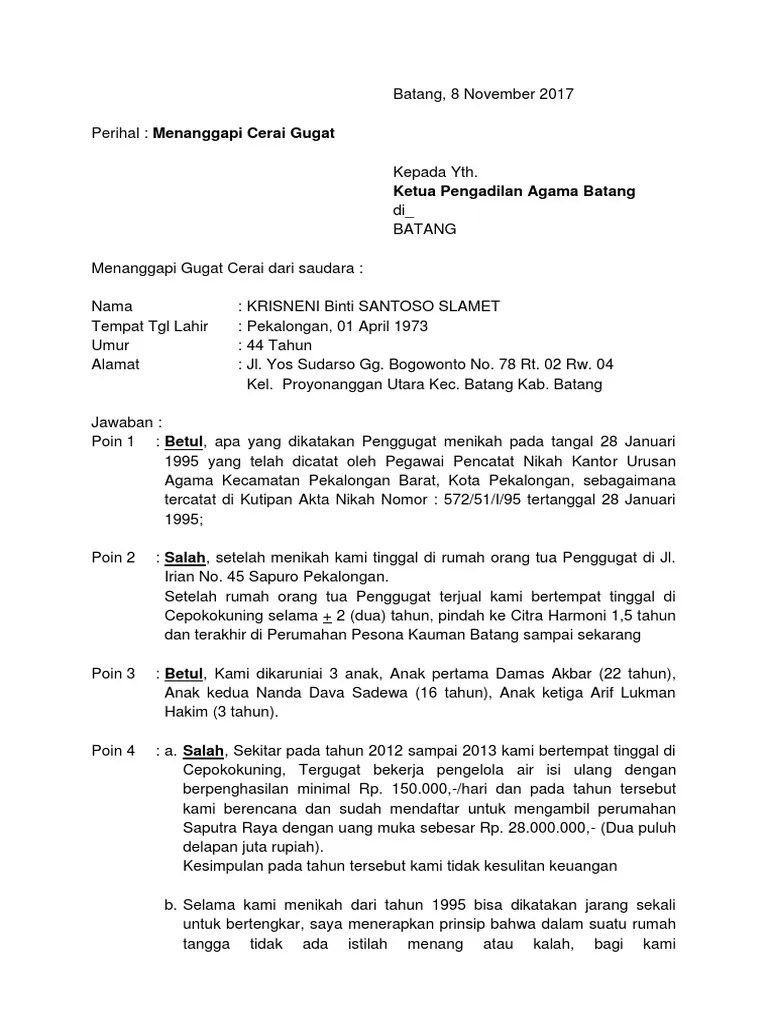 Contoh surat jawaban atas gugatan perceraian. Apabila gugatan yang diajukan mengandung cacat formil maka gugatan yang diajukan tidak sah, dengan demikian harus dinyatakan tidak dapat diterima (niet onvantkelijke verklaard). Tergugat telah mengajak penggugat untuk pindah ke apartemen, namun selalu berkeberatan dan berkeinginan menumpang terus 13. Mengurus proses perceraian sendiri tanpa pengacara. Bahwa perceraian merupakan jalan tempuh yang terbaik,. Majelis hakim pemeriksa perkara perdata nomor : Bersama ini tergugat ii mengajukan eksepsi dan jawaban atas gugatan penggugat atas perbuatan melawan hukum dan ganti kerugian dalam perkara aquo yang didaftarkan oleh penggugat pt. 1 menolak eksepsi serta jawaban atas pokok perkara dari tergugat untuk seluruhnya; Contoh eksepsi dan jawaban tergugat gugatan perceraian : Setelah membaca dan mempelajari dengan seksama surat gugatan dari penggugat, maka bersama ini kami sampaikan jawaban dan eksepsi atas surat gugatan tersebut. Klip plastik indonesia melalui kuasanya juandyra & patrners law. Jawaban dan gugatan rekonpensi dalam perkara no.416 /pdt.g / 2009 / pa.sbg. Jawaban tergugat mengenai pokok perkara ( verweer ten principale ).